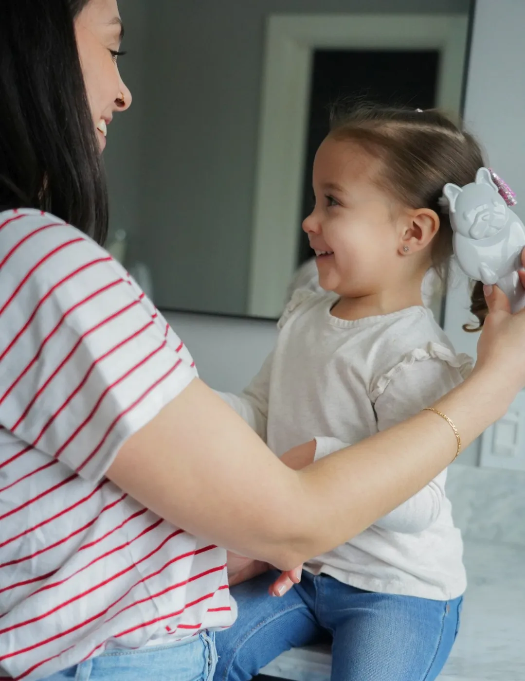 Set Perie si Pieptene pentru Par Model Bulldog (2 piese) Un set adorabil si practic, ideal pentru ingrijirea zilnica a parului bebelusului tau. Peria moale si pieptenele cu dinti fini sunt special concepute pentru pielea sensibila a bebelusilor, ajutand la indepartarea blanda a impuritatilor si prevenirea incurcaturilor din par. Caracteristici principale Design jucaus cu model bulldog, care face din fiecare moment de ingrijire o adevarata bucurie pentru copil. Perie cu peri moi, perfecta pentru scalpul sensibil al bebelusilor. Pieptene cu dinti fini, ideal pentru a descurca usor parul si a preveni firele rupte. Materiale sigure, fara BPA, concepute special pentru pielea delicata a copiilor. Recomandat pentru utilizare zilnica. Un accesoriu esential pentru ingrijirea bebelusului, cu un design dragut, care imbina functionalitatea cu place
