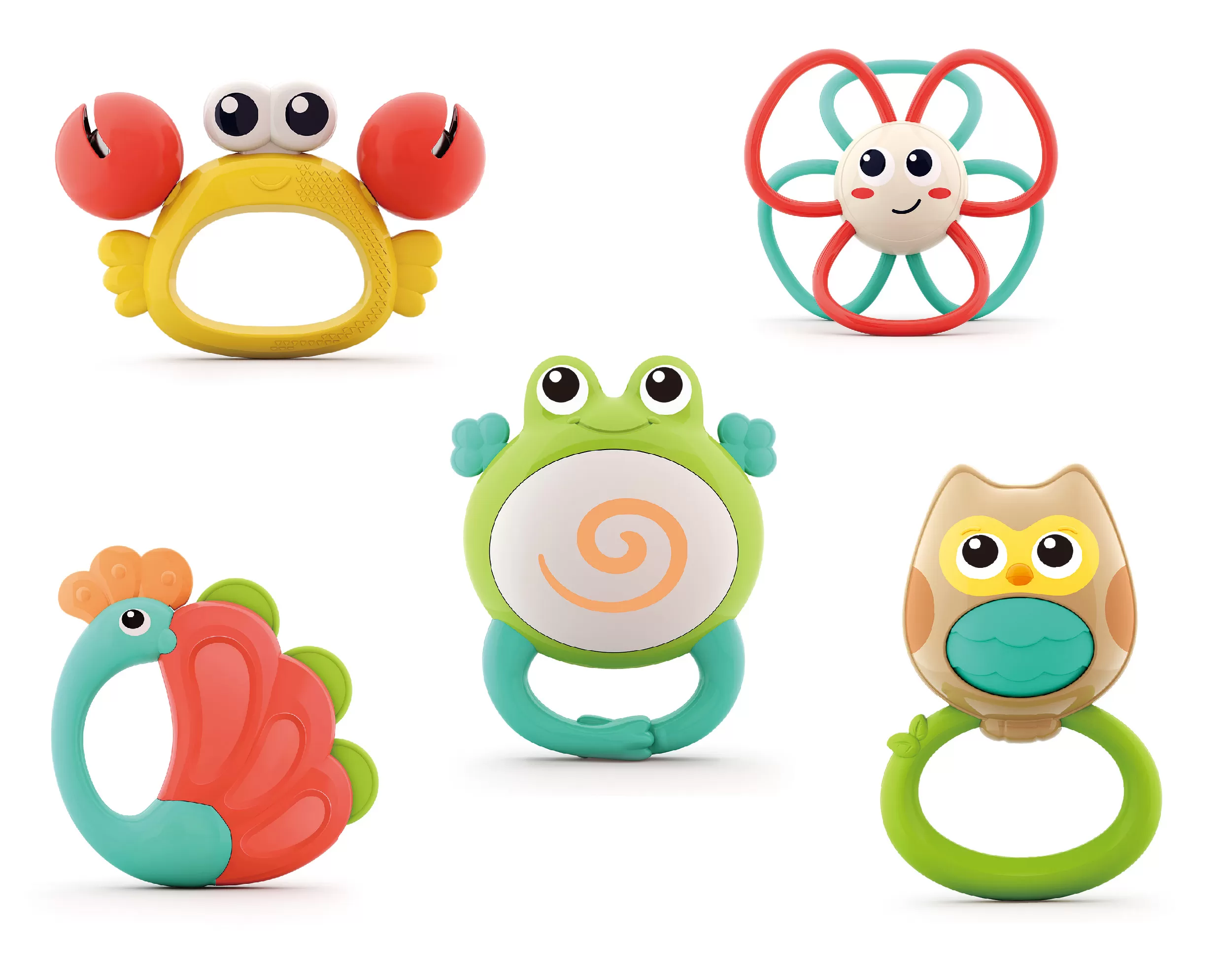 Jucariile bebe Hola Toys sunt produse special pentru dezvoltarea din primele luni ale bebelusului. Formele speciale si culorile vii incurajeaza copilul sa exerseze si sa se joace stimuland astfel dezvoltarea individuala. Nu contine bpa. Este confectionata din materiale sigure si durabile. Acest set include 5 jucarii zornaitori avand forma de animalute.