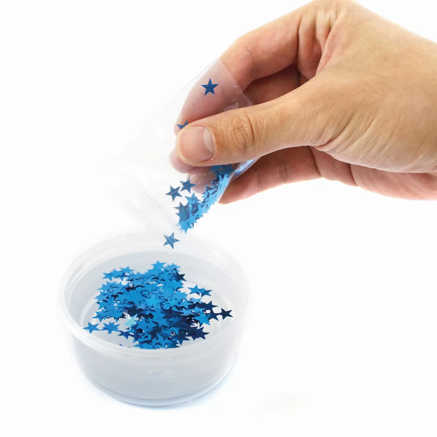 Clear Glittzy Slimy cu sclipici separat. Amesteca-ti propriul Glittzy Slimy! 3 tipuri de sclipici in interior. 4 sortimente de culori de sclipici Roz / Auriu / Albastru / Albastru / Alb. Cu 120g de Glittzy Slimy.