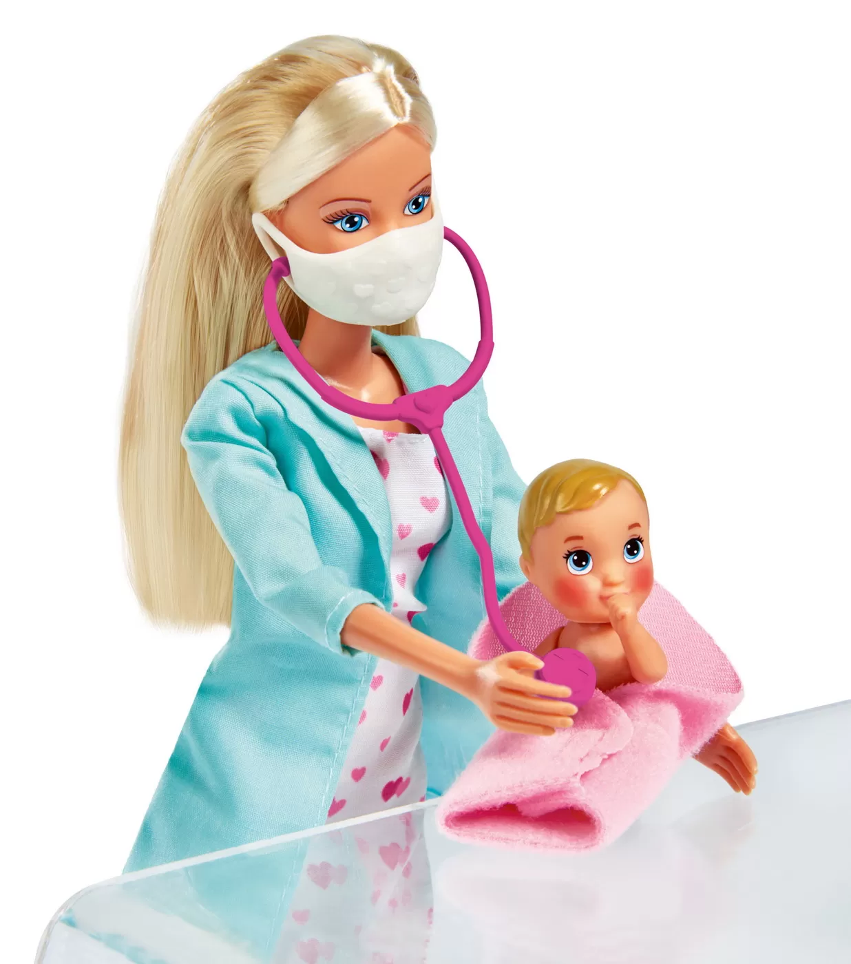 Steffi este doctor pediatru si are grija de un bebelus cu febra. Setul include accesorii si masca de protectie pt papusa. Inaltime papusa 29 cm. Steffi LOVE este o adevarata papusa de moda. &Icirci plac hainele sic, coafurile la moda, sora ei mai mica Evi si, bineinteles, iubitul ei Kevin. Fetele isi pot coafa si imbraca papusa in tendintele actuale ale modei.Steffi lucreaza ca medic pediatru si poarta halat si masca de fata. Pacientul tau este un copil mic care are febra. Poate asculta copilul cu stetoscopul si poate vindeca copilul cu accesoriile. Bebelus care isi schimba culoarea copilul mic are febra. De aceea i s-au inrosit obrajii. Sterge copilul cu apa si roseata va disparea.