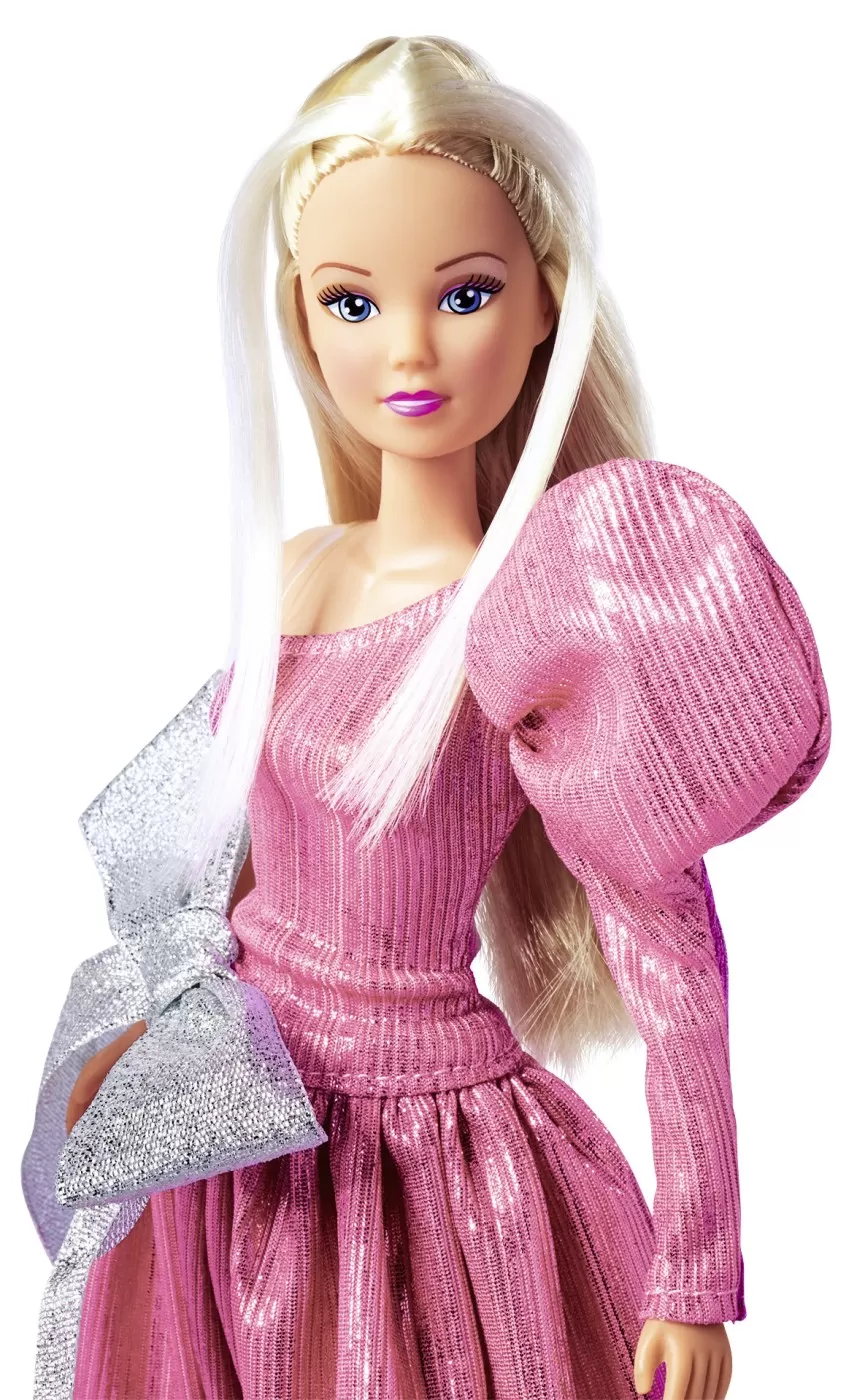 Steffi LOVE este o adevarata papusa fashion. &Icirci plac hainele sic si tunsorile la moda. Fetele isi pot coafa si imbraca papusa conform tendintelor actuale ale modei. Steffi incanta intr-o frumoasa rochie de seara roz cu maneci bufante si o fundita uriasa argintie. Este pregatita pentru covorul rosu in aceasta tinuta. Inaltime papusa 29 cm.