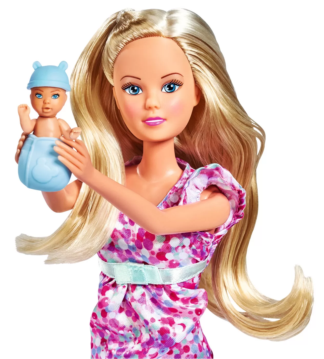 Steffi este insarcinata iar sexul bebelusului este o surpriza. Descopera daca va fi baietel, fetita sau chiar gemeni. Inaltime papausa 29 cm, setul include si 11 accesorii.Steffi LOVE este o adevarata papusa la moda. Îi plac hainele sic, coafurile la moda, sora ei mai mica Evi si, bineinteles, iubitul ei Kevin. Fetele isi pot coafa si imbraca papusa in tendintele actuale ale modei. Surpriza Steffi LOVE Baby este disponibila in trei rochii grozave. Selectia este aleatorie.Steffi este insarcinata si isi asteapta cu nerabdare copilul. Dar nimeni nu stie inca ce sex are bebelusul. Un baietel? O fetita? Sau poate chiar gemeni?Capac pentru burta care se poate deschide pentru a afla numarul de copii si sexul, husa pentru burta poate fi indepartata cu usurinta si se poate naste un copil sau doi. Daca apoi va intoarceti stomacul, Steffi are un abdomen plat.Setul include un pachet surpriza grozav cu peste 11 accesorii potrivite pentru cei mici. Asa ca Steffi poate avea mare grija de bebelusii ei. Potrivit pentru copii de la 3 ani.