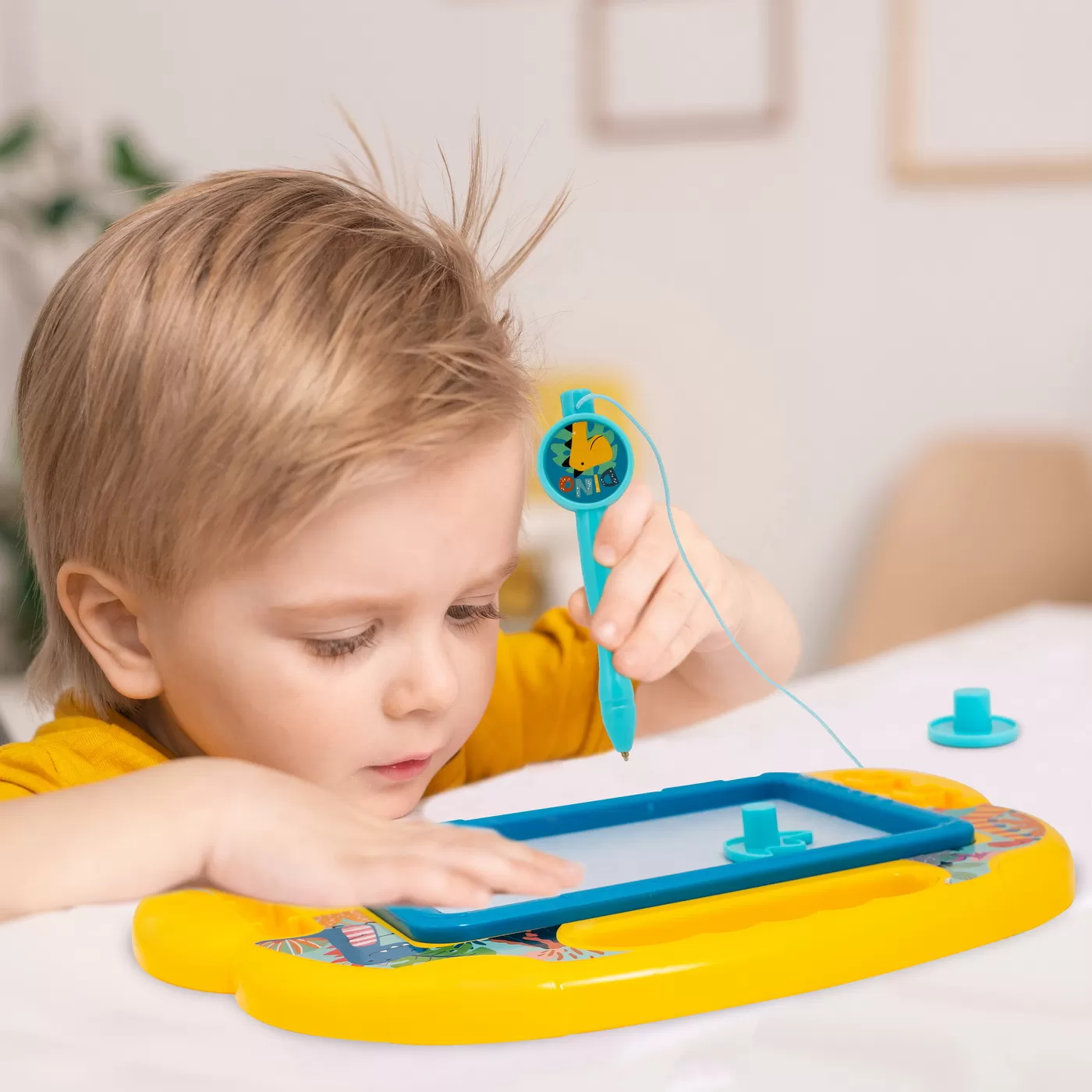 Cu tabla magnetica Magic Scribbler distractia nu se termina nicioadata! Tablita functioneaza datorita fortei magnetice copilul deseneaza cu un stilou magic special (varful are un mic magnet), iar pe tablita se formeaza un desen frumos! La final, trece glisorul special si desenul va disparea si poate incepe un nou desen. Tablita este echipata cu doi magneti de diferite forme, care pot diversifica suplimentar distractia. Cu un design colorat si atragator, cu elemente Baby Dinosaur, tablita are un maner din plastic pentru o transportare usoara, perfecta pentru diversificarea timpului liber pentru fiecare copil care iubeste distractia creativa.