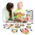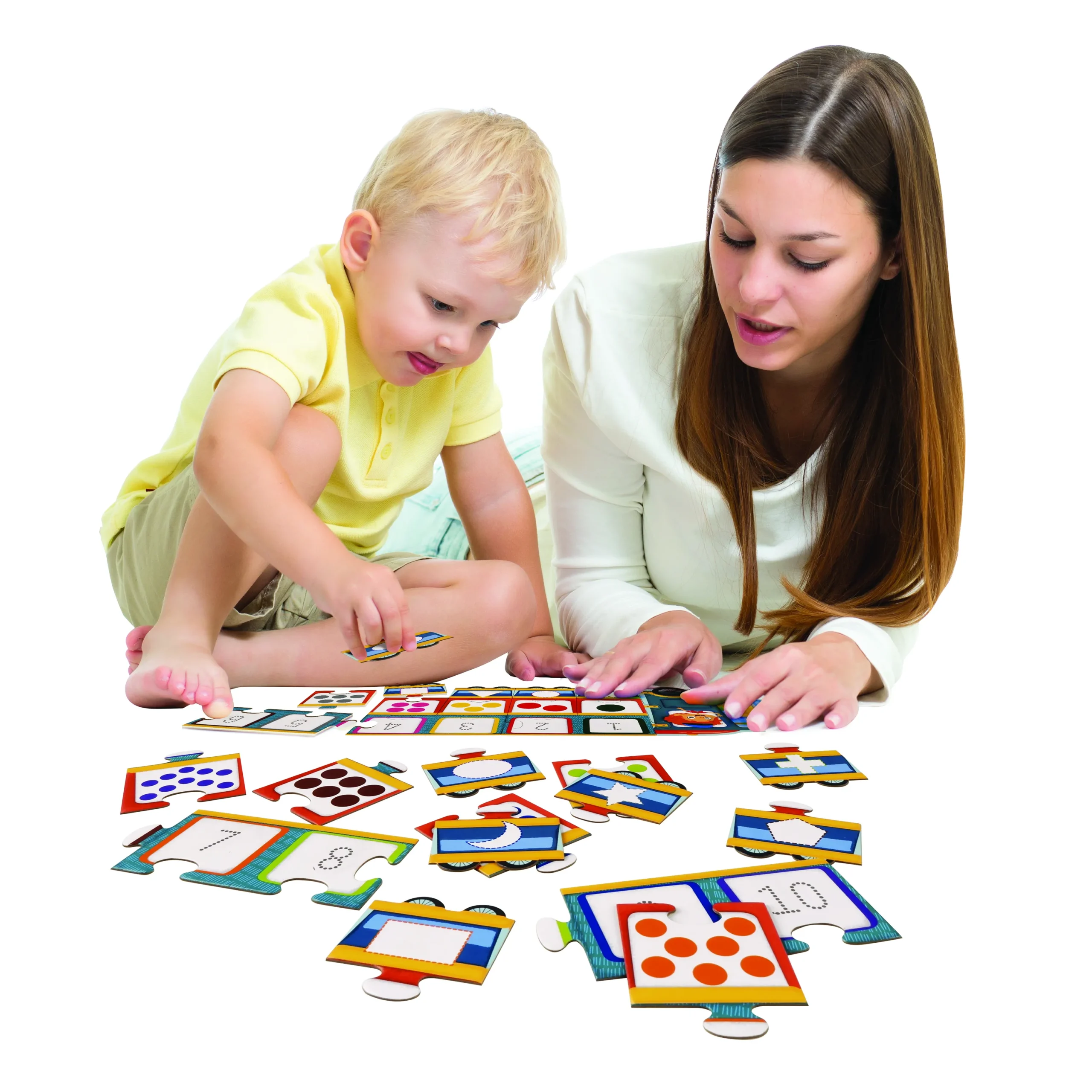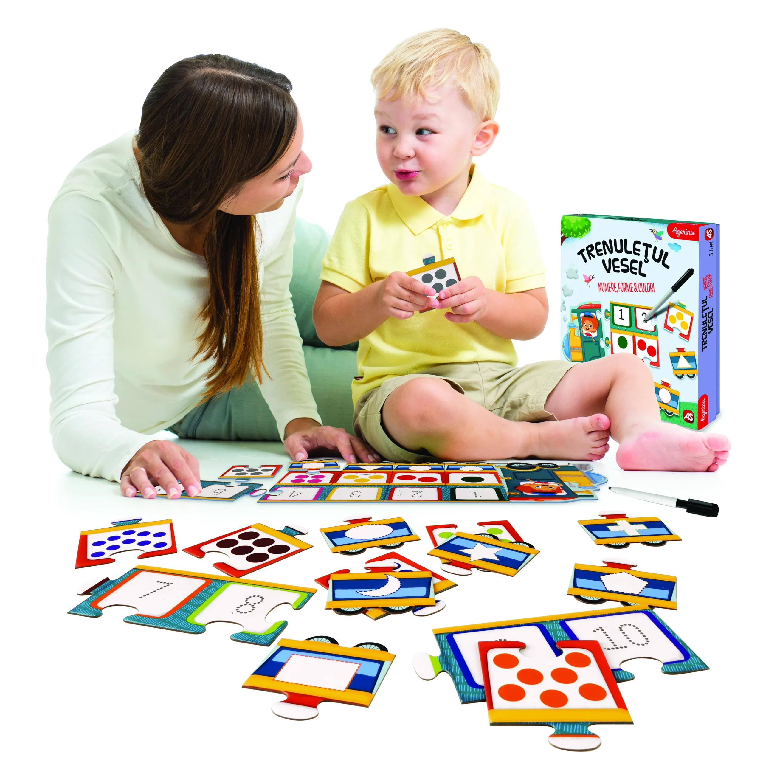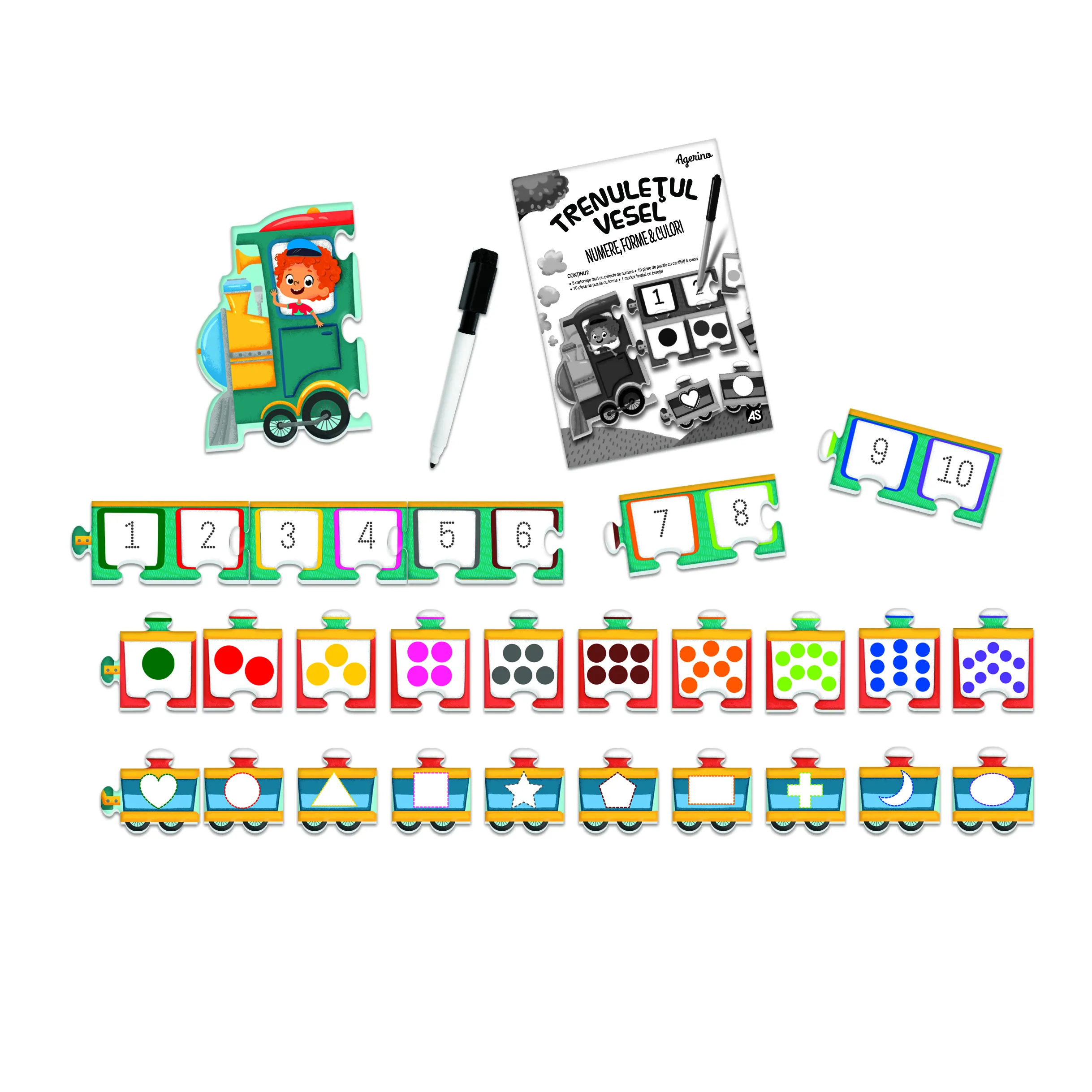 Trenuletul vesel Numere, Forme &amp Culori este un joc educativ progresiv care vine sa-l ajute pe copil sa invete numerele si cantitatile, sa deseneze numerele si formele, invatand simultan culorile de baza. Copilul gaseste mai intai piesele cu numere conectandu-le la locomotiva trenului,apoi, recunoaste numarul si incearca sa gaseasca cantitatea corecta, adaugand a doua piesa cu puncte colorate. In cele din urma, conform culorii punctelor, copilul incearca sa gaseasca forma corecta care are conturul de aceeasi culoare. Continut 5 cartonase cu numere, 10 piese de puzzle cu cantitati si culori si 10 piese de puzzle cu forme, 1 manual si 1 marker lavabil. Varsta recomandata 3-6 ani. Valori dezvoltatea – abilitati cognitive, miscarile fine ale mainilor, memoria, autonomia.