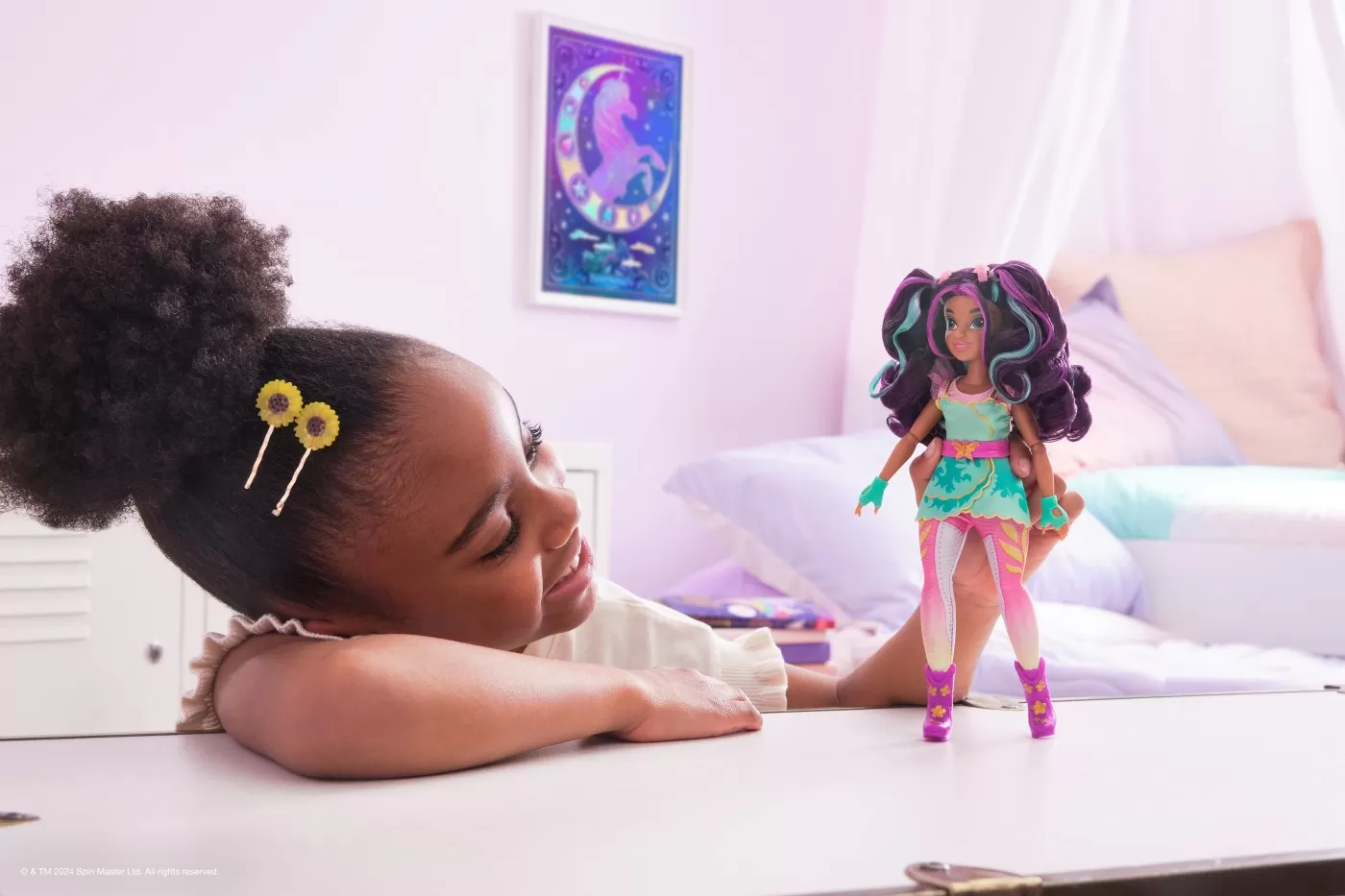 Creeaza acasa aventuri fermecatoare Academia Unicorn cu papusile la moda Sophia, Ava si Isabel. Inspirate din serialul animat NETFLIX si din seria de carti de succes in care prietenia tine fraiele, aceste papusi de 24,1 cm pentru fete dau viata personajelor. Frumos detaliata din cap pana in picioare, personalitatea efervescenta a Avei iese la iveala in parul ei cu suvite (accesoriu de coafat inclus) si in tinuta ei caracteristica de calaret de unicorn rochia roz si albastru-verzui, pantaloni ombre cu marcaje Magia plantelor, cizme florale si agrafe de par, manusi si accesorii pentru papusi cu centura cu fluturi. Cu 9 puncte de articulatie, pozitioneaz-o pe Ava in timp ce protejeaza Insula Unicornului si magia sa si calareste in aventura cu unicornul ei, Leaf (vandut separat). Legaturile magice dintre elevii Academiei Unicorn si unicornii lor vor starni povesti pline de imaginatie. Pentru mai multe moduri de a experimenta Academia Unicorn alaturi de personajele tale preferate, cauta papusile Sophia si Isabel si unicornii lor, Wildstar Lumina Curcubeului si River (suvoi) (fiecare se vinde separat) si extinde-ti lumea. Pentru copiii carora le plac unicornii si jucariile cu cai, papusile si accesoriile, jocurile de casa de papusi, jucariile de colectie, jucariile de plus si multe altele, jucariile Academia Unicorn sunt cadouri distractive de de ziua de nastere pentru fete sau cadouri pentru orice ocazie.