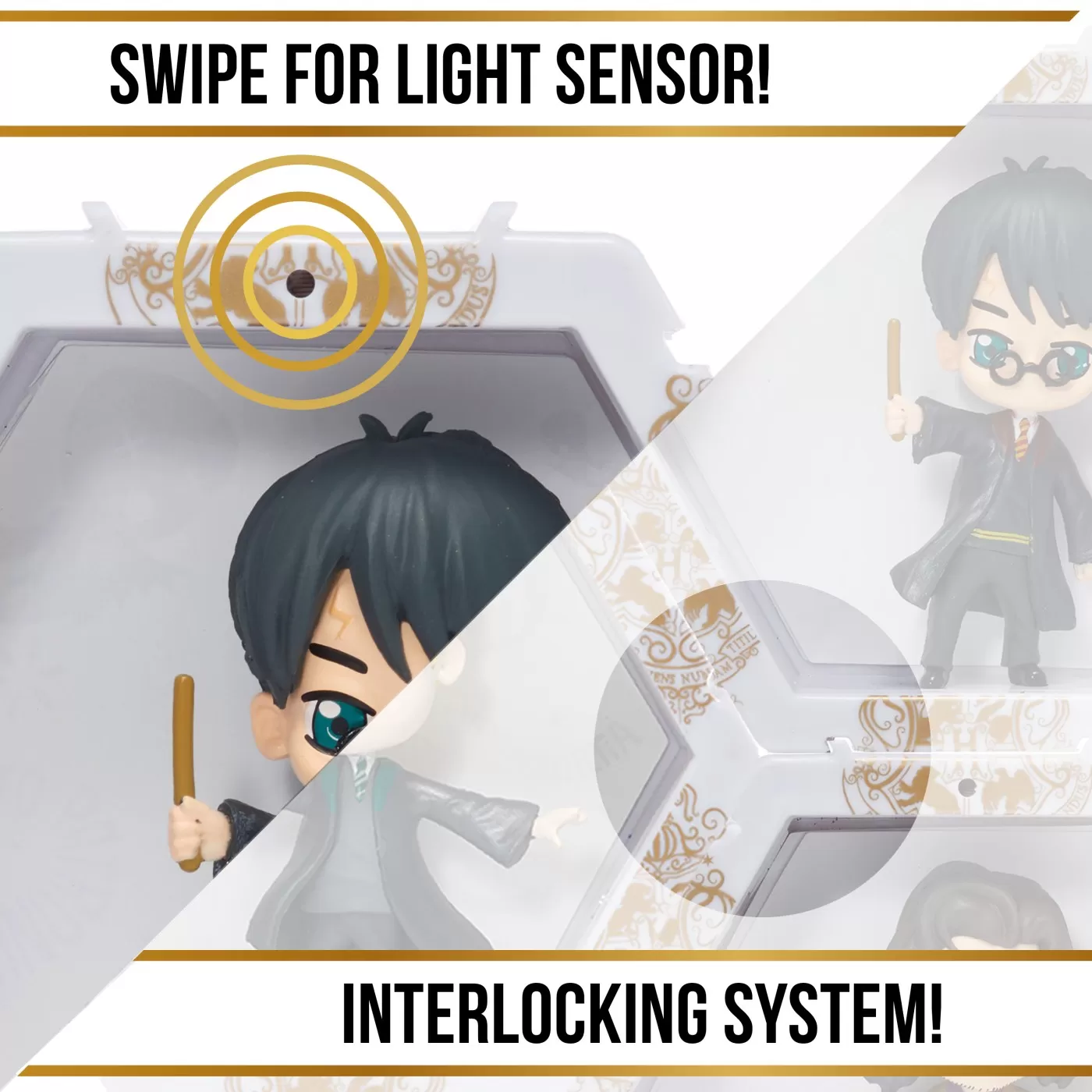 Fiecare personaj este situat in propriul POD in forma de hexagon cu lumini UV si senzor IR incorporat. Pur si simplu miscati mana peste senzor pentru a lumina WOW-ul! POD-ul! Misca-ti mana in fata POD-ului pentru a-l lumina si a dezvalui pictograme ascunse in spatele WOW!Pod-ului! Lumina se stinge automat dupa 30 de secunde. Conectati-le in cateva secunde! Colectia ta poate lua diferite forme si avea in fiecare zi, alt look! Limita e doar de imaginatia ta! Puteti chiar sa va scrieti numele sau initialele pentru a crea un afisaj care este fara indoiala si unic al dvs.! Colectionati si conectati personajele favorite printr-o colectie mai vasta de eroi WOW! PODS! Sunt disponibile personaje Marvel, DC, Disney, Disney Frozen, Sonic, Jurassic World, Harry Potter, Minionii si altele. Acest pachet contine personajul Harry Potter.